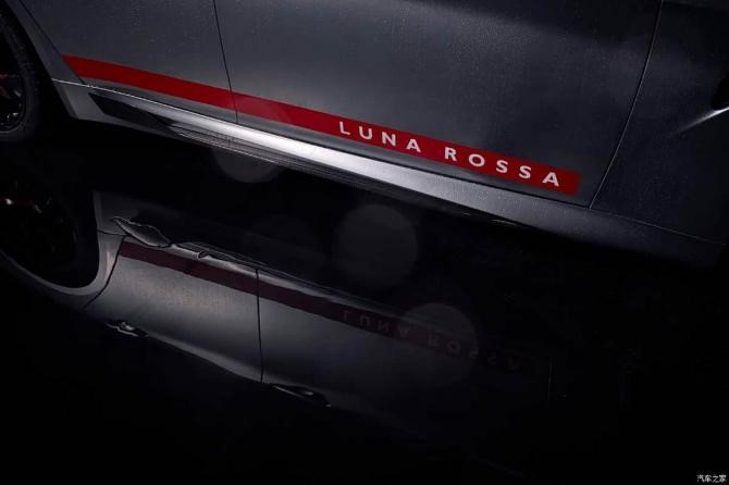 来看官图,新车的配色灵感源于2024年巴塞罗那第37届美洲杯的Luna Rossa AC75帆船,车身采用虹彩效果的漆面展现金属质感,侧裙配备红色拉花并镶嵌“Luna Rossa”字样,19英寸轮圈同样加入了红色点缀,配合红色刹车卡钳,营造出很强的视觉冲击力。值得一提的是,该车车标也是品牌历史上首次采用红色作为底色。