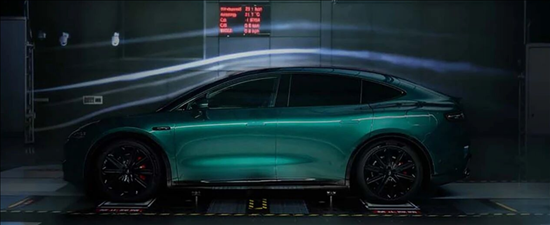 据了解,工程团队对整车造型进行了深度开发。车头采用下压式引擎盖与主动式进气格栅,有效梳理前端气流。溜背式车顶线条与大幅倾斜的A柱、D柱平滑衔接,避免了车尾的乱流分离。此外,车身侧面采用了隐藏式门把手与全平整底盘护板,并对外后视镜、轮圈等细节进行了低风阻造型打磨。这些设计共同作用,大幅降低了行驶中的气动阻力。